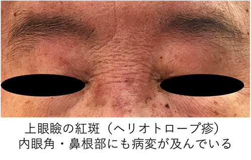 典型的な発疹としては、うわまぶたが赤く腫れぼったくなったり(ヘリオトロープ疹 [図1] )、手指、肘、膝の関節の伸びる側の皮膚表面が赤くなったり、皮がむけて皮膚の表面がやや厚ぼったくなります(ゴットロン徴候、ゴットロン丘疹 [図2] )。また、患者さんによっては、頭皮・顔・耳・首回り・お腹・背中・お尻の側面の皮膚が赤くなり、時にかゆみを伴うことがあります。