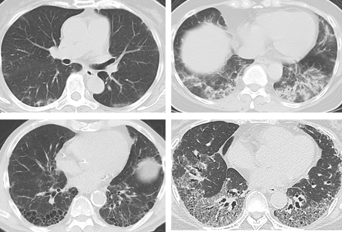 図3. 間質性肺疾患のコンピューター断層撮影(CT)画像(個々の患者さんによって肺炎の分布や画像特徴は異なります)