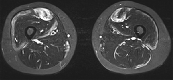 図4. 筋MRI(太腿部の断面像:白い箇所が筋肉内の炎症を示唆する所見)