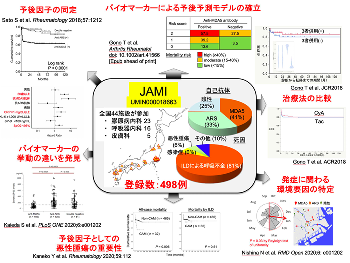 そのため、これら問題を克服する方法の一つにレジストリ構築が挙げられる。そこで、私たちはPM/DM-ILDの予後予測因子の解析を目的とした多施設レジストリ A multicenter retrospective cohort of Japanese patients with PM/DM-associated ILD; JAMI (UMIN000018663) を立ち上げ、日本全国44施設の関連診療科 (膠原病内科、呼吸器内科、皮膚科) から2011-2015年に499例を登録し、バイオマー カーを含めた予後予測モデル、発症と関連する環境要因、治療法の比較などの成果を国際学会や国際誌に報告してきた (下図)。