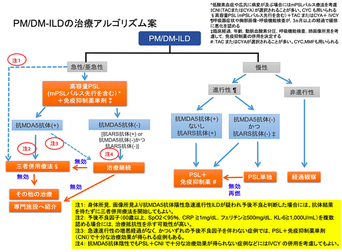 さらに、日本呼吸器学会と日本リウマチ学会が2020年に策定した「膠原病に伴うILD 診断・治療指針 」で、PM/DM-ILD の治療アルゴリズム案を以下のように提案した。
