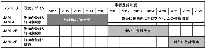 ②JAMI-2R:JAMI登録終了後の2016年から2021年8月までの症例を後向きに登録し、前向きにアウトカムを収集。